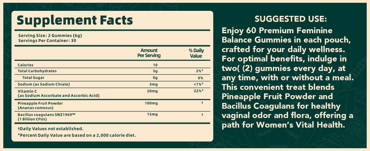 PREMIUM NATURAL INGREDIENTS - We've condensed all the benefits oftraditional feminine support supplements into a tasty, convenient form. OurPremium Feminine Balance Gummies offer a delicious way to support your pHbalance,immune defense and vaginal flora.